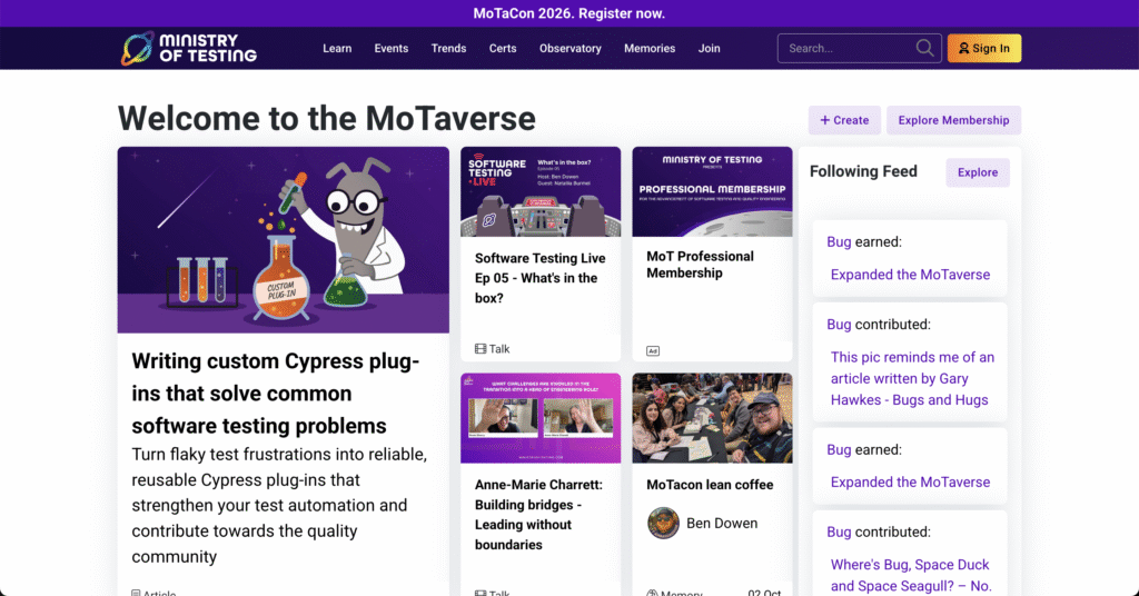 A great example of a community is Ministry of Testing. It is one of the most respected and active communities in the software testing / quality engineering domain. It began as a UK-based forum and has grown into a globally recognized platform offering events, education, community forums, resources, and certification.
