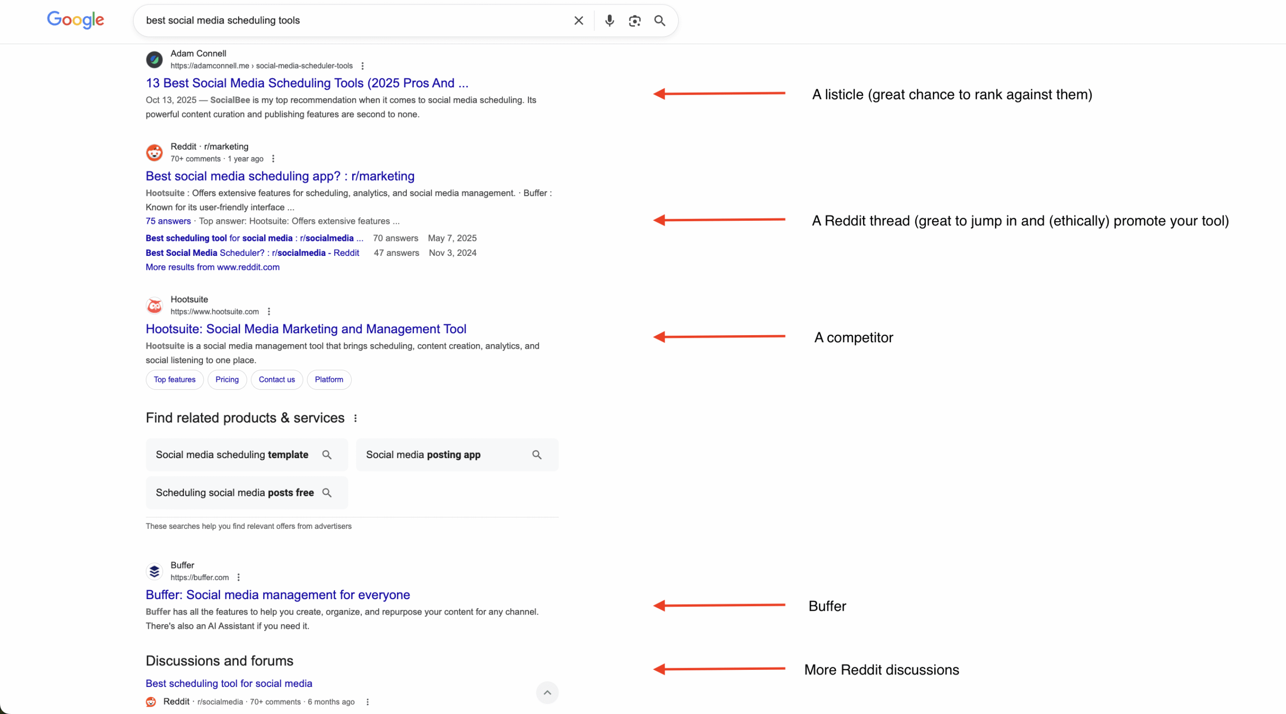 Next, I search on Google to confirm the search intent of these keywords. I tried searching “best social media scheduling tools”, and here’s what I see: