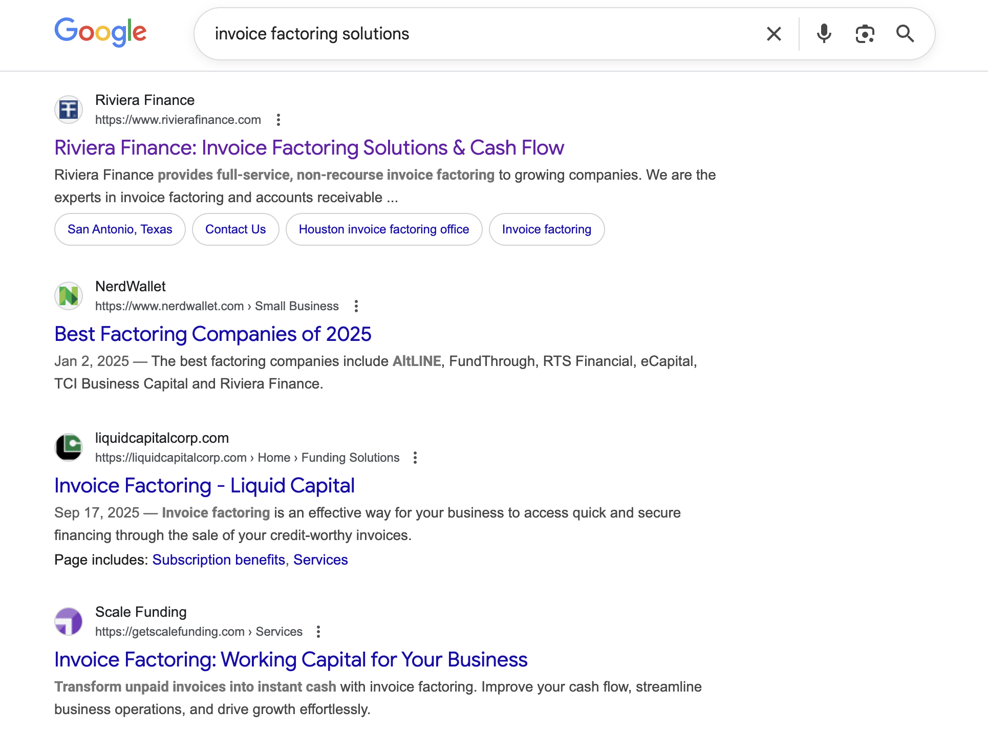 Here’s what I get when I search for “invoice factoring”, just a generic term, and since Riviera Finance is a full-service invoice factoring company, they show up in search results: