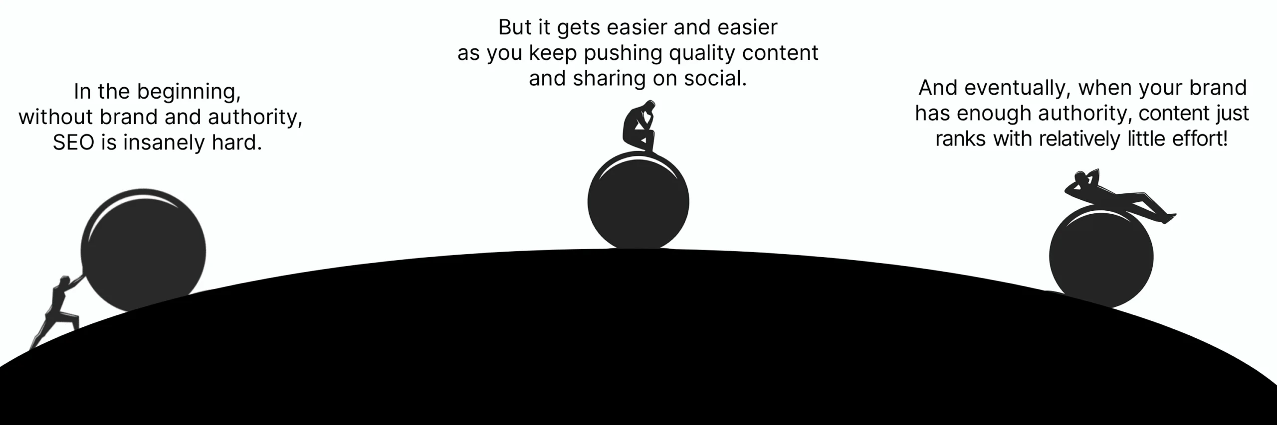 The challenge is that many teams expect a quick payoff, sometimes in just a couple of months. Sure, that’s possible if Google trusts your site. In that case, every new piece of content has a chance to perform well. But for smaller or newer players, there’s no shortcut. With little ranking power and no built-in audience, results take time. Most businesses give up before the flywheel starts spinning, just when it’s about to get good.