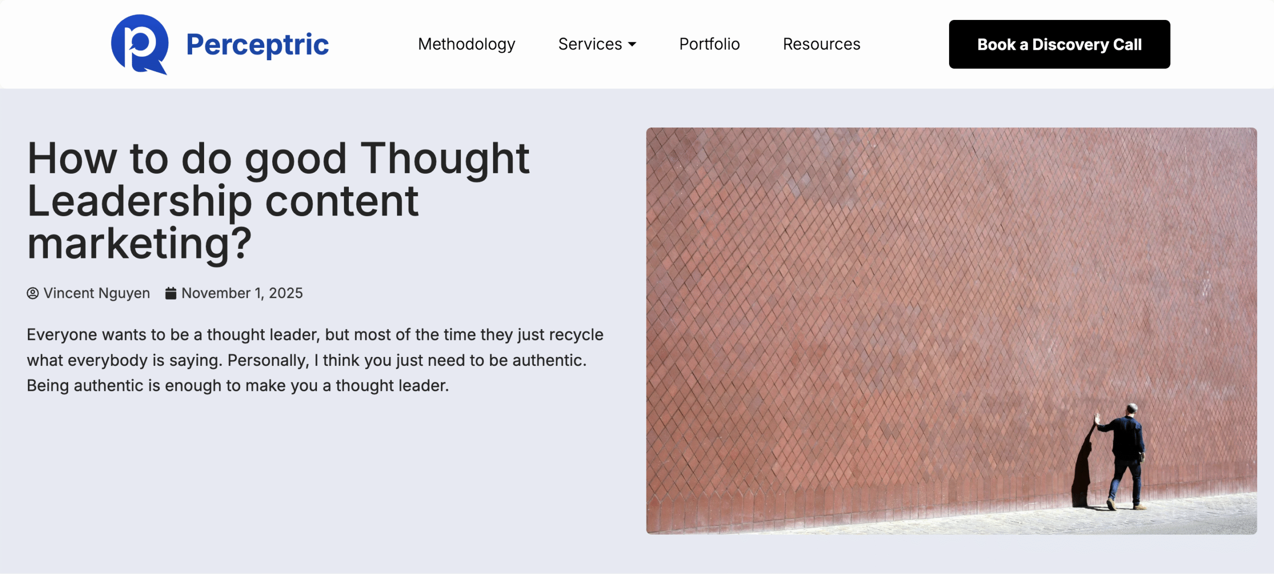 - It must come from people who have actually been in the trenches. I hold the content on Perceptric’s blog (and our clients’ blogs) to the same standard. Expert-led content is essential.