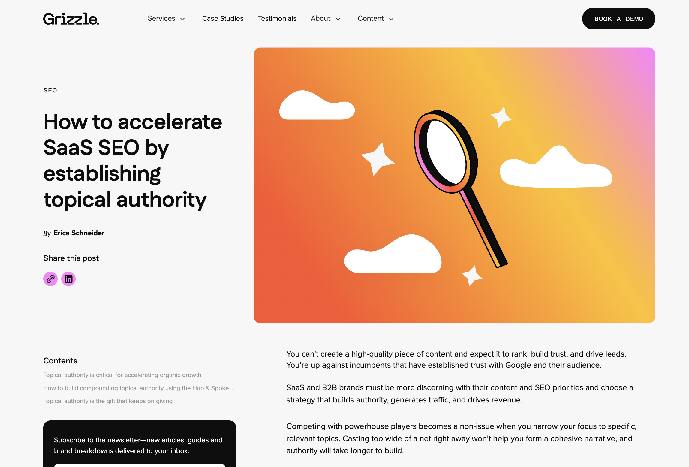 Grizzle is a pretty impressive B2B content marketing agency that leans more on the creative side. They also follow similar playbook like what we’re doing at Perceptric, including:
