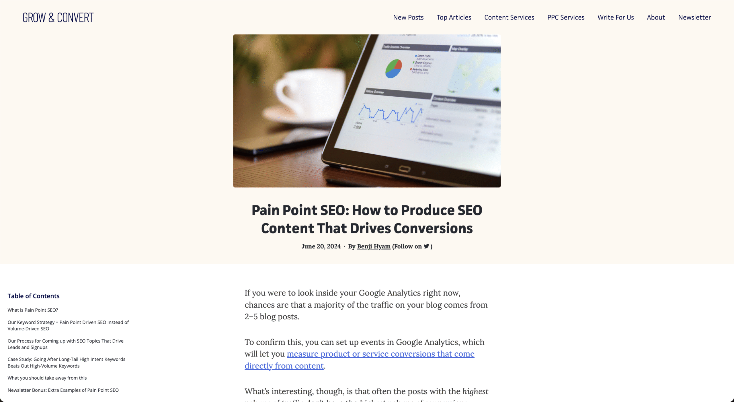Grow and Convert is a content marketing agency best known for its “Pain-Point SEO” framework. Pain-point SEO is a methodology designed to prioritize high-intent keywords that drive signups and demos instead of vanity traffic.