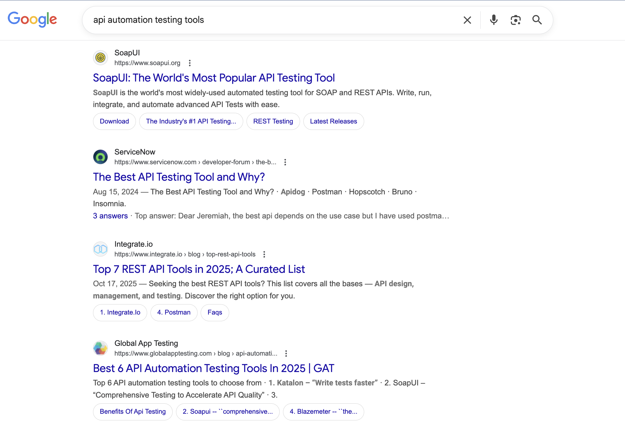 As you can clearly see, Google is ranking either listicles, or tools that are dedicated to doing API testing (which is SoapUI in this case).