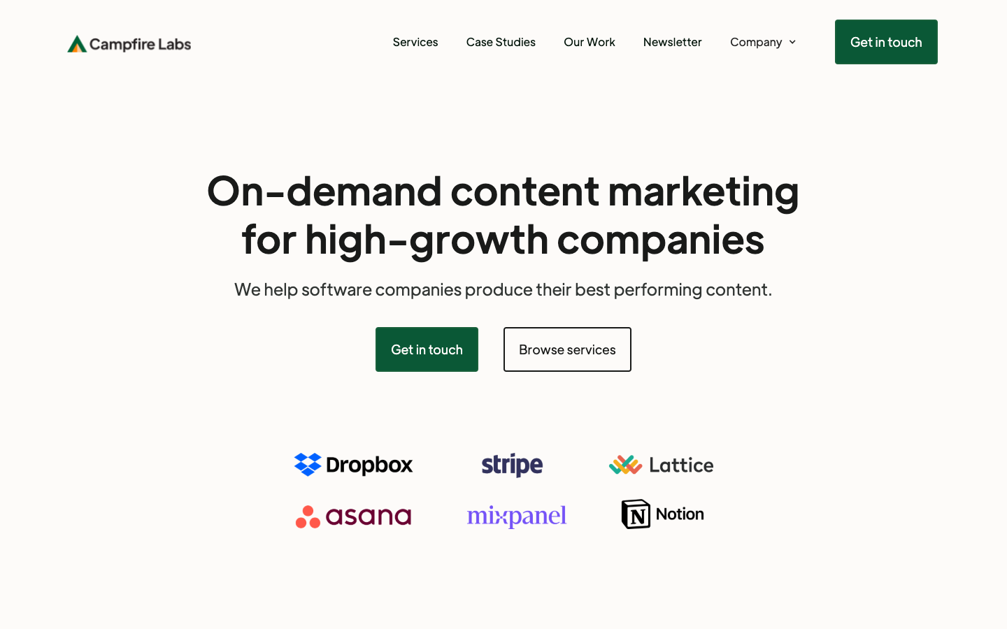 Campfire Labs is a storytelling-driven content studio built around interviews and human-centric narratives. They help you publish memorable, emotionally resonant stories that showcase real customer experiences. Their strength is elevating B2B content above standard SEO copy.