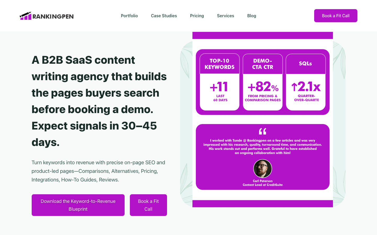RankingPen is an SEO writing agency specializing in keyword-led, intent-driven blogs with deep expertise in SaaS. They help you capture high-intent traffic with structured, ICP-aligned editorial output.