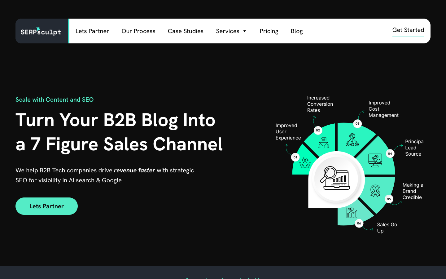 SERPscupt positions themselves as a partner that not only produces content but also shapes your entire organic demand engine with customer insights and conversion-aligned content.