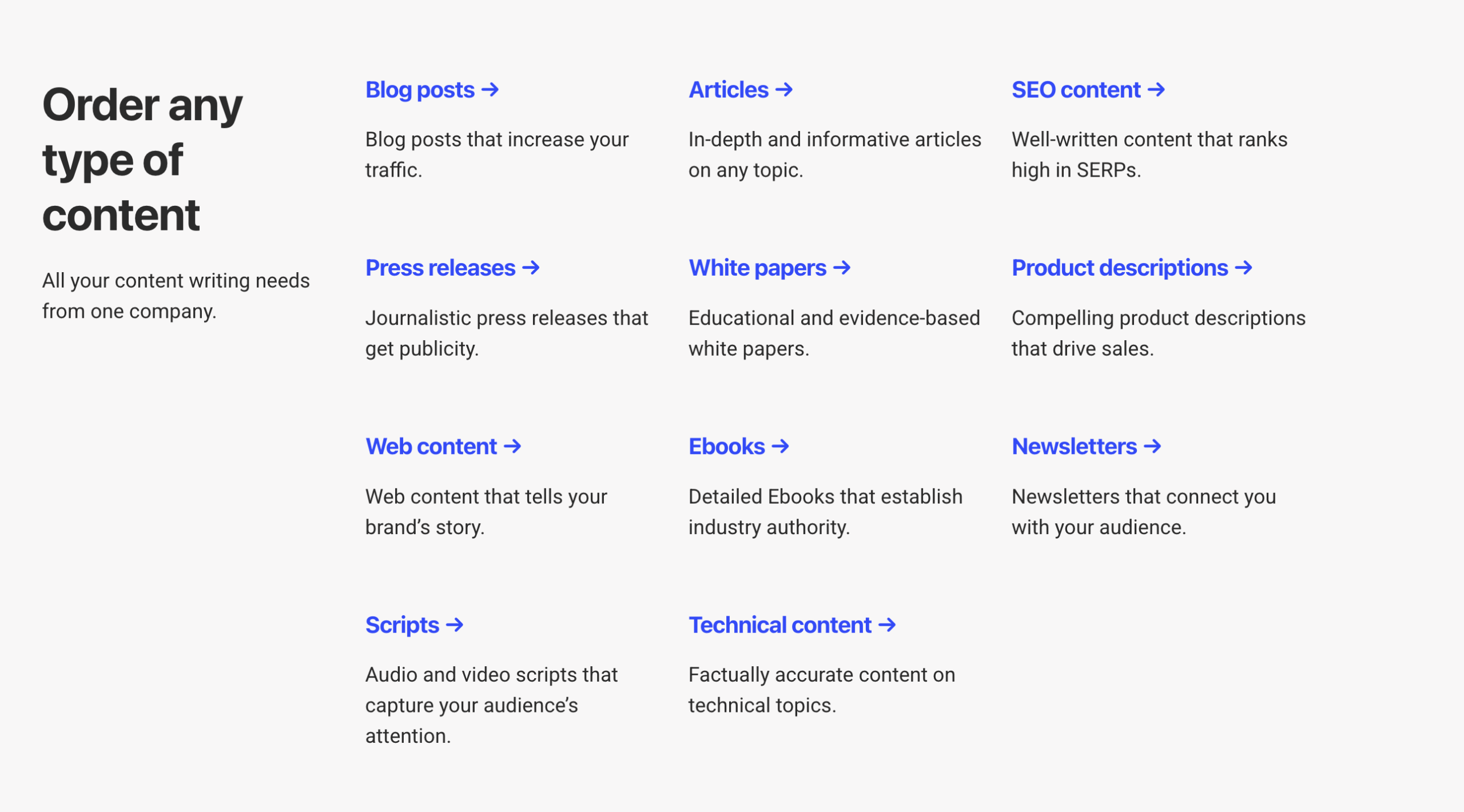 Services offered: Full-service blog writing, content at scale, multi-purpose content