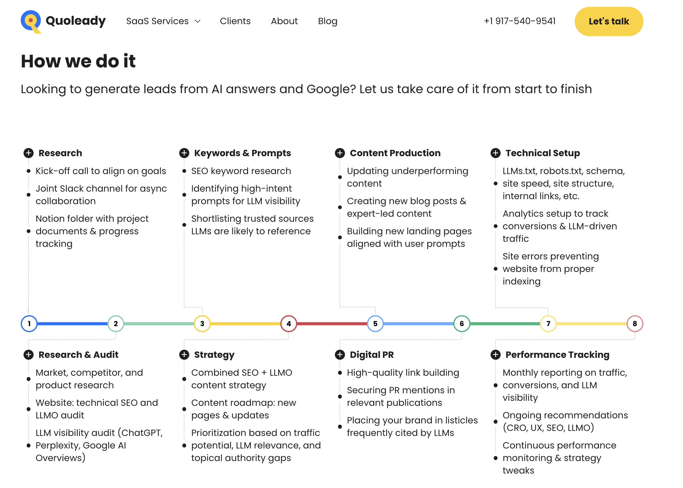 From their service page, it’s easy to see that Quoleadly offers a really comprehensive suite of services, ranging from keyword research to technical SEO and content writing.