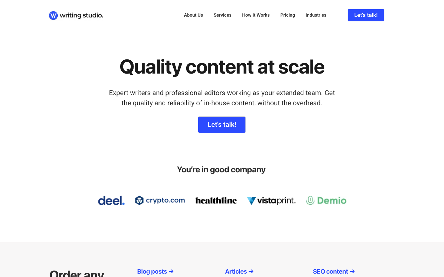 Writing Studio is a content writing agency that delivers clean, dependable content for B2B teams. They help you maintain a consistent publishing cadence without heavy editorial oversight. Their strength is producing search-aligned blog posts that fit seamlessly into your content calendar.