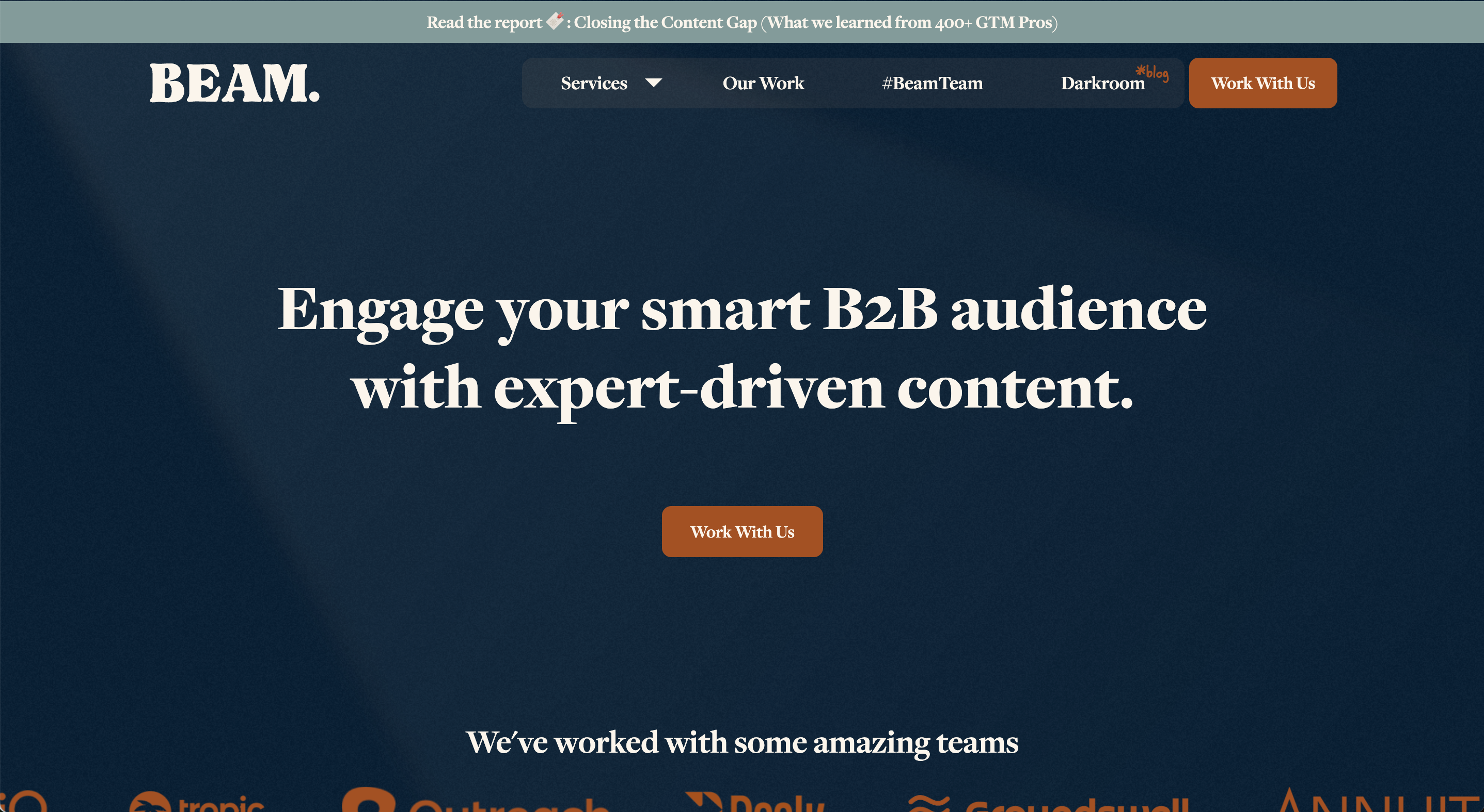 Their content is pretty upbeat too, so if you’re bored of the same-same corporate tone in B2B marketing, Beam Content can breathe new air into your messaging.