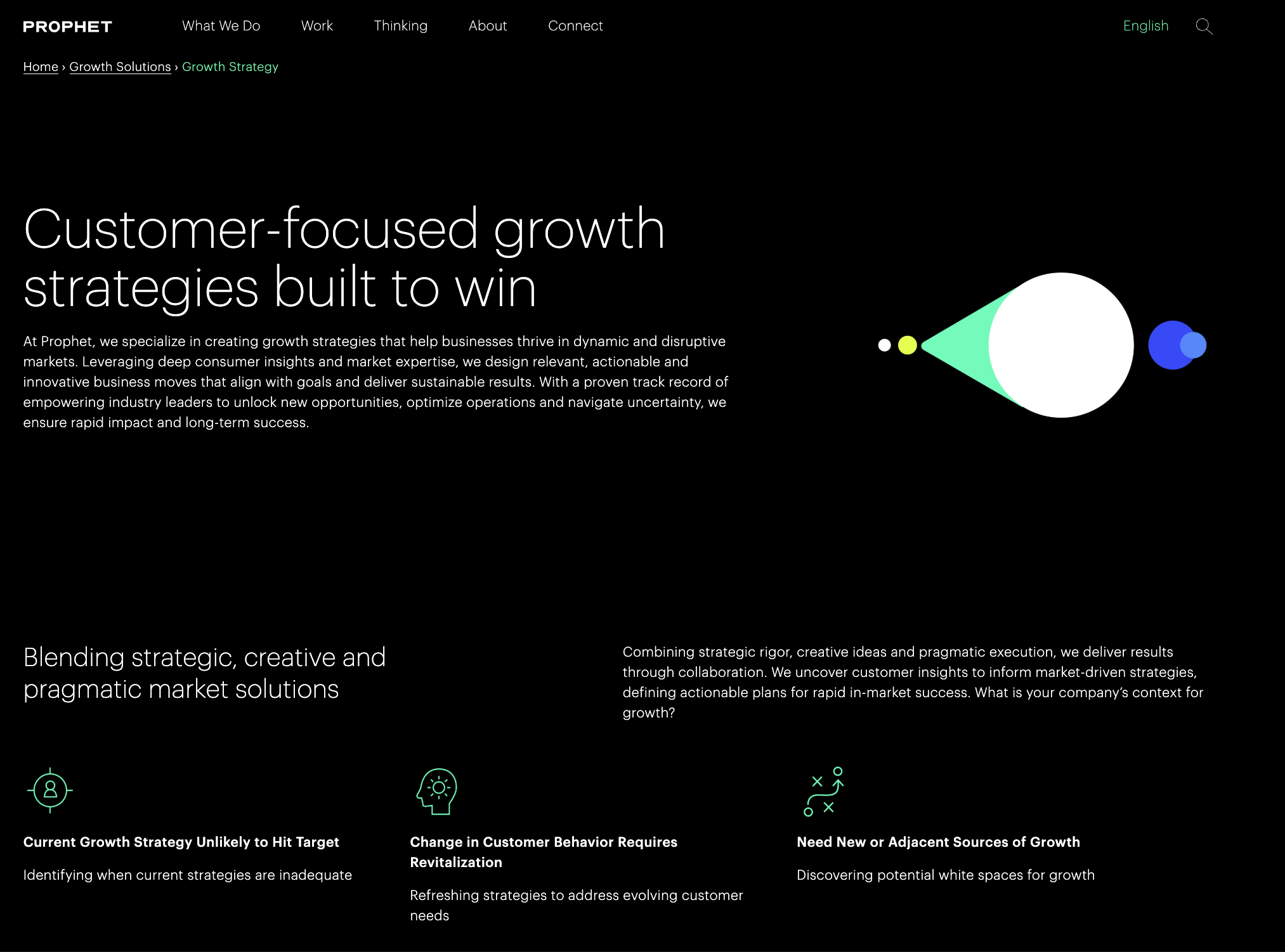 • Prophet’s website is truly a masterclass in clean design and intellectual authority. The color palette is really professional and modern, along with a crisp typography that sets them apart. The hero section uses a powerful, rotating set of headlines that immediately communicate the high-level, strategic outcomes they deliver (“Growth for a changing world”).