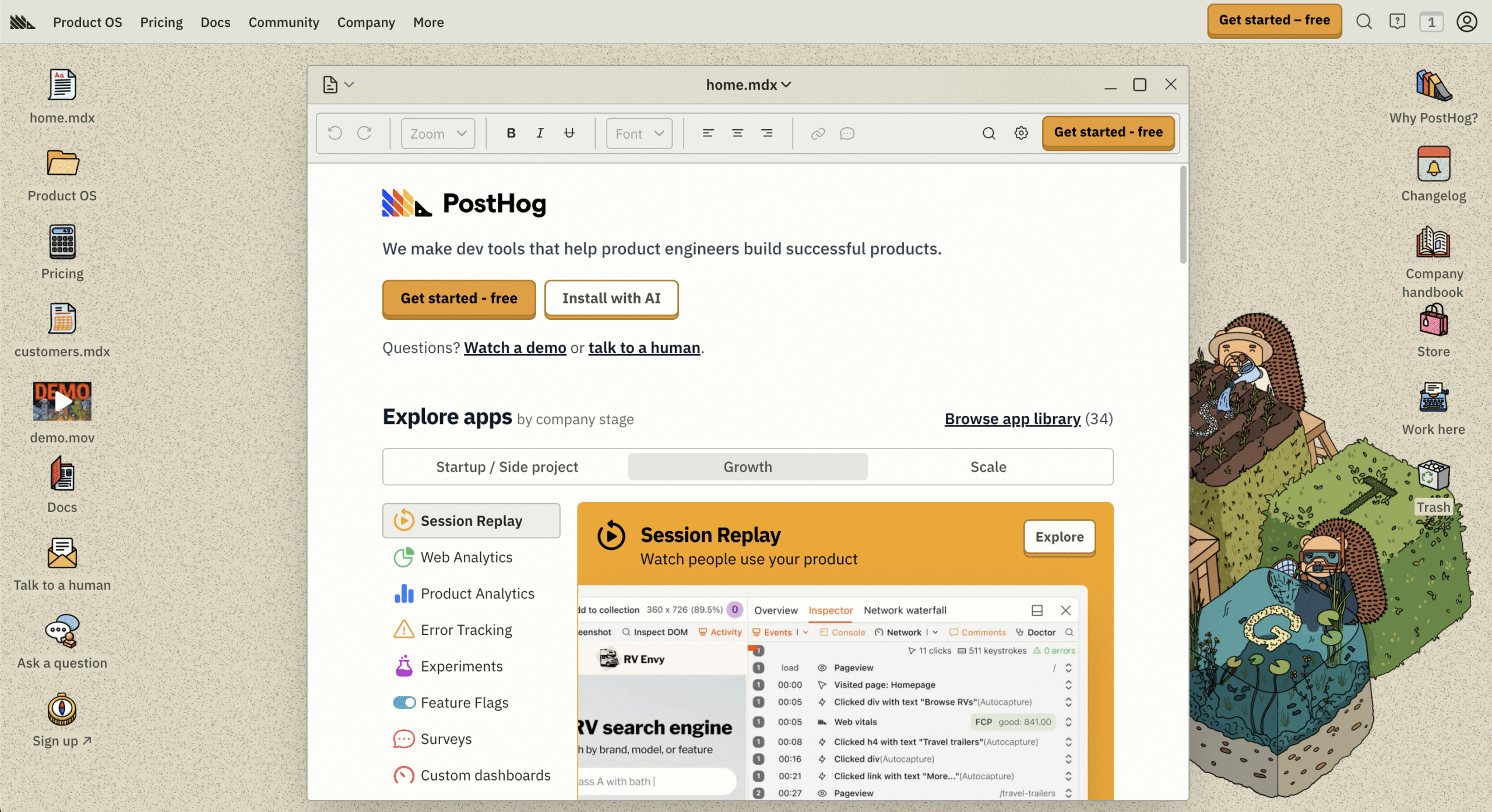 - I think it’s safe to say that PostHog has the best UI/UX/branding this world has ever seen. Their website is structured as one big “OS” on which websites pop up, and you can interact with those websites.
