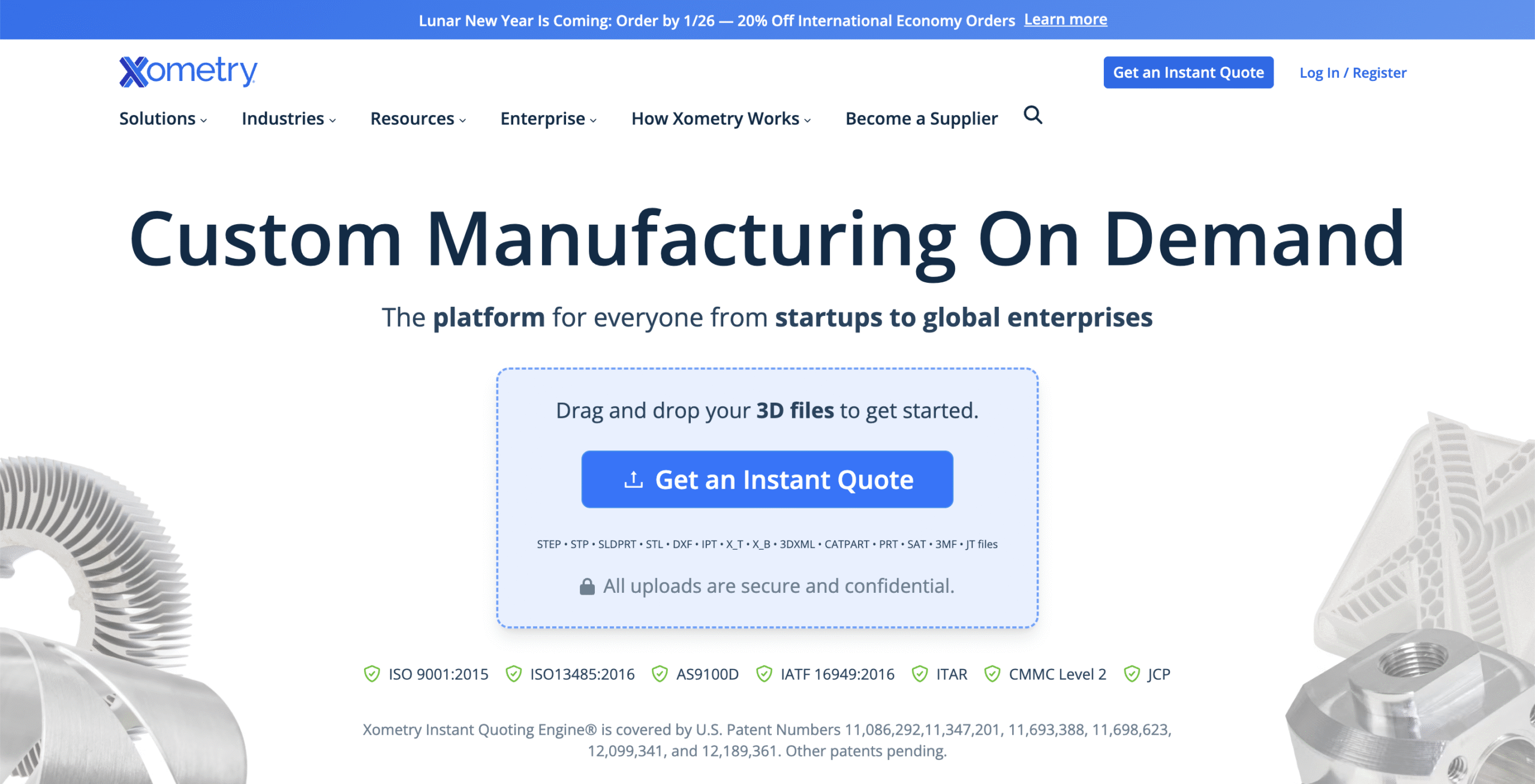 Xometry is an on-demand custom manufacturing platform that connects engineers, product teams, and procurement with a global network of vetted manufacturing partners. It covers CNC machining, sheet metal fabrication, injection molding, 3D printing, and more.