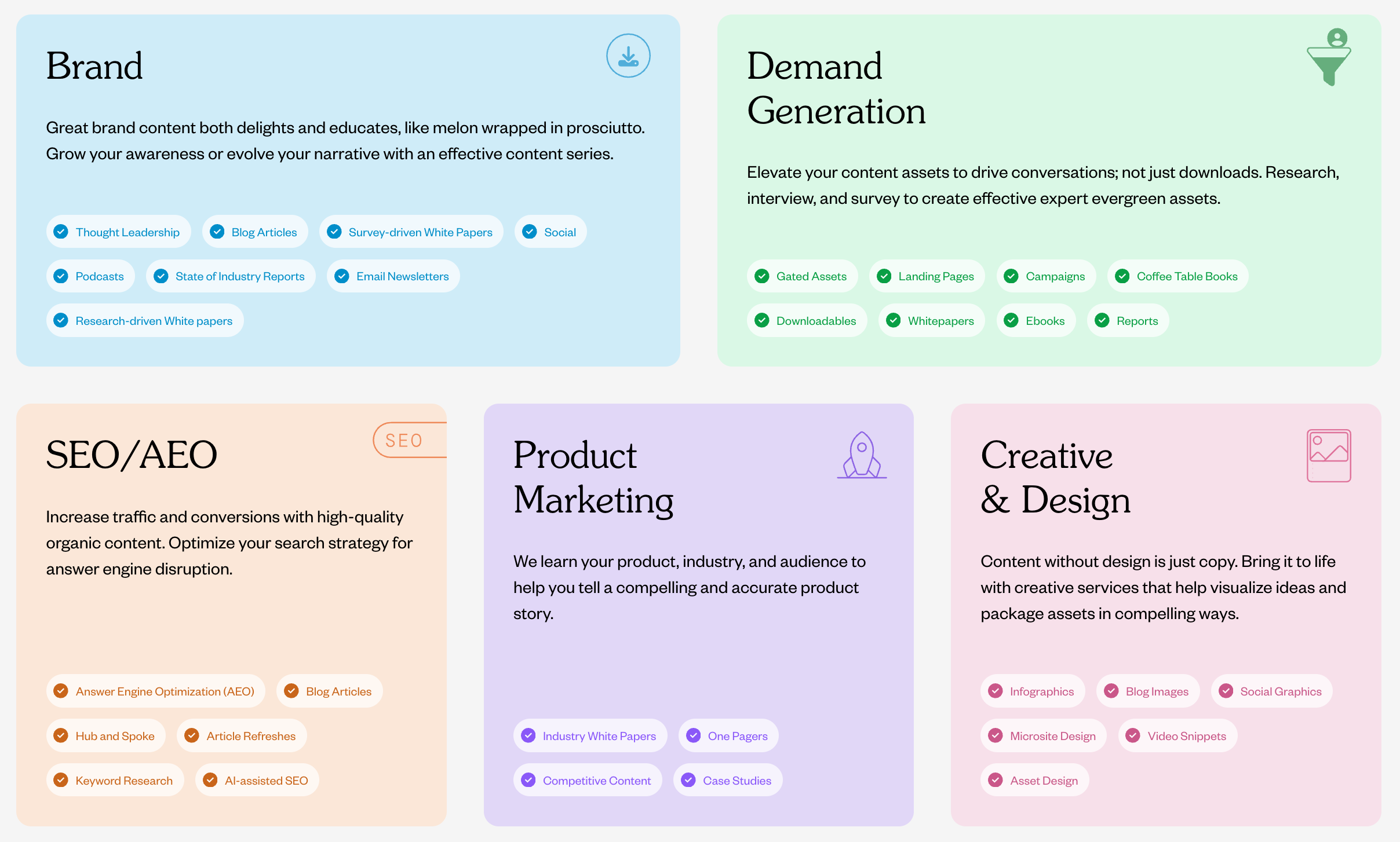Their positioning centers on what they call a “Unified Content Engine”, a performance-driven editorial system that spans the full buyer journey, from SEO-driven awareness to product marketing and sales enablement, where each asset supports a specific stage and objective rather than being a collection of random acts of content