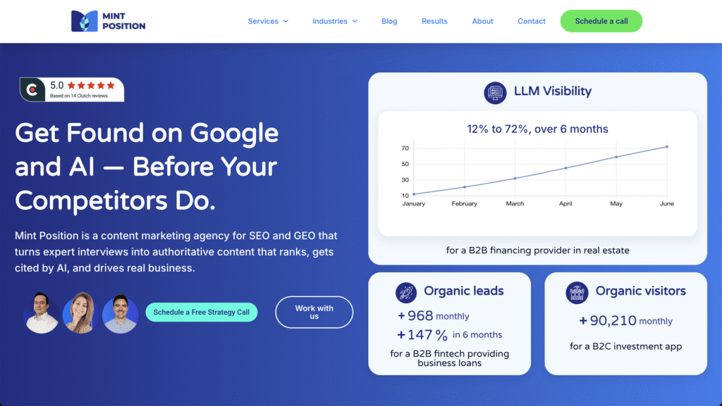 Mint Position’s Multi-Engine Optimization approach includes simultaneous end-to-end SEO and GEO content marketing, BOFU landing pages, technical audits, and digital PR. They’ve worked with fintech brands like Lula, Sarwa, and Duckfund, delivering #1 rankings and consistent B2B lead generation growth.