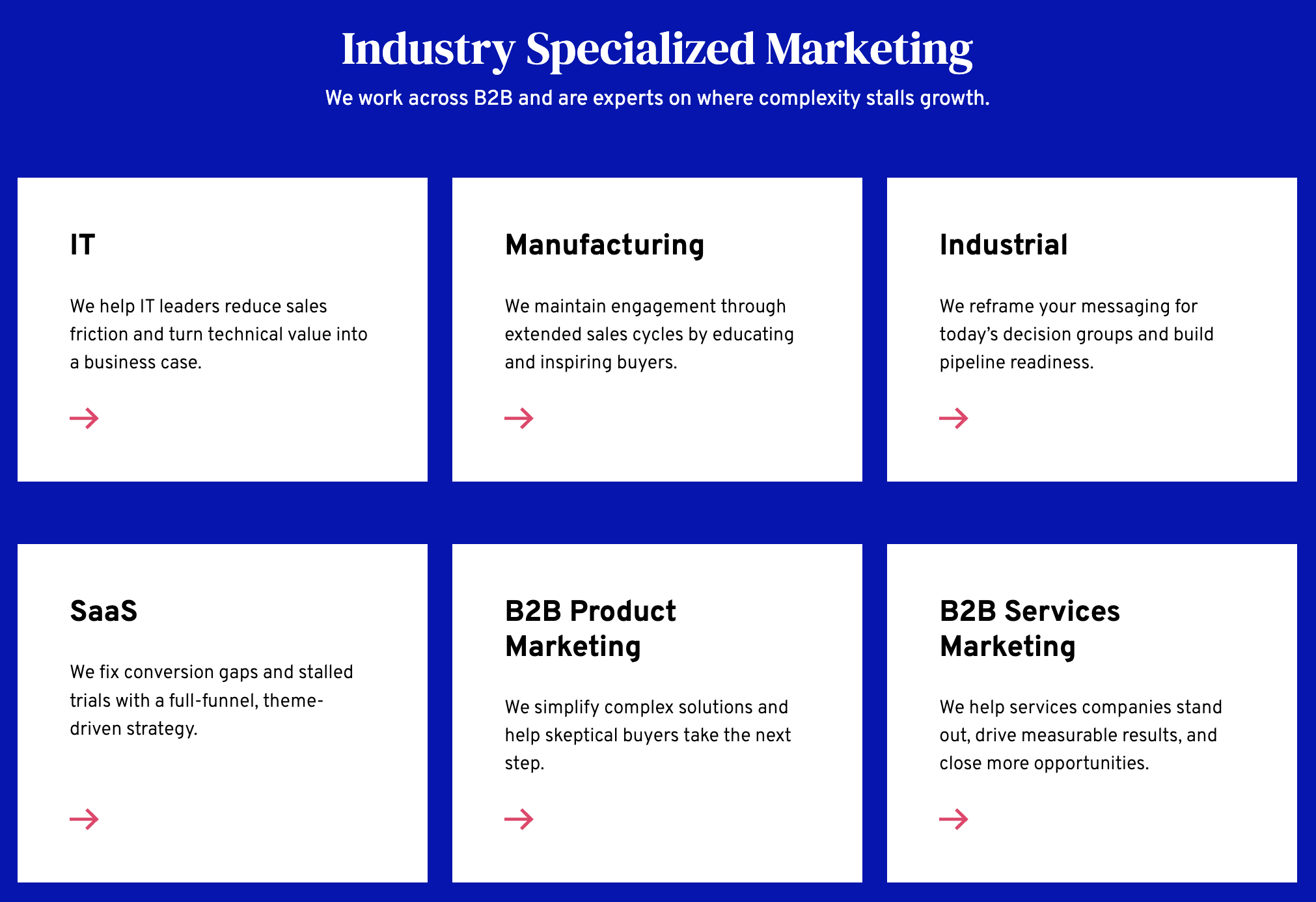 - Services offered: Marketing strategy, enterprise branding, SEO, web development, digital advertising (search, social, programmatic), technical content development, trade shows, PR, creative, video, lead generation, email marketing, marketing automation, analytics, and full integrated communications support. Everything that a B2B marketing engine needs.