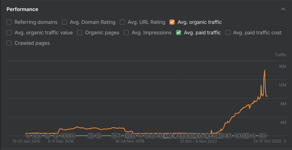 And Reddit is indeed the heart of Internet. It has around 250 million organic visits every month (as of Oct 2025), compared to a meager 1 million in Oct 2023. That’s a 25,000% growth in 2 years!
