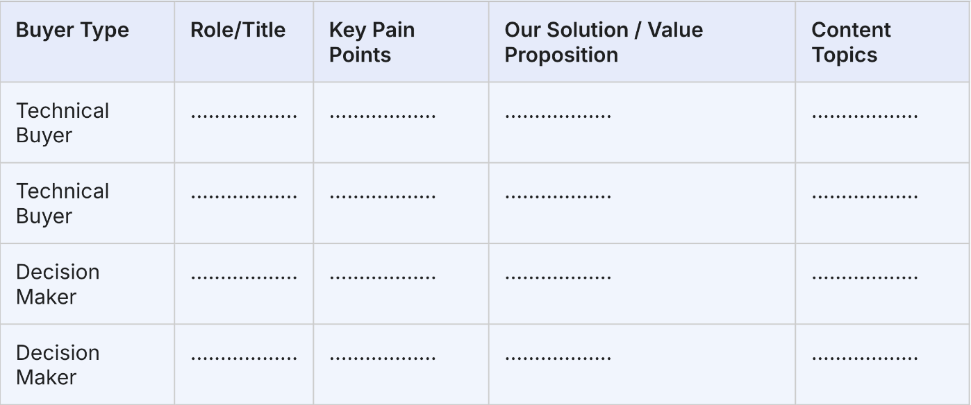 | Buyer Type | Role / Title | Key Pain Points | Our Solution / Value Proposition | Content Topics |