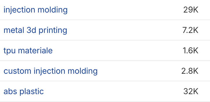 And they ranked for a lot of the important engineering keywords too. These are their highest ranking keywords (which means if you search those terms it’s likely that you’ll see them on the top). If you’re a manufacturer in injection molding, you’d love to be ranked on the top when people search that keyword too.