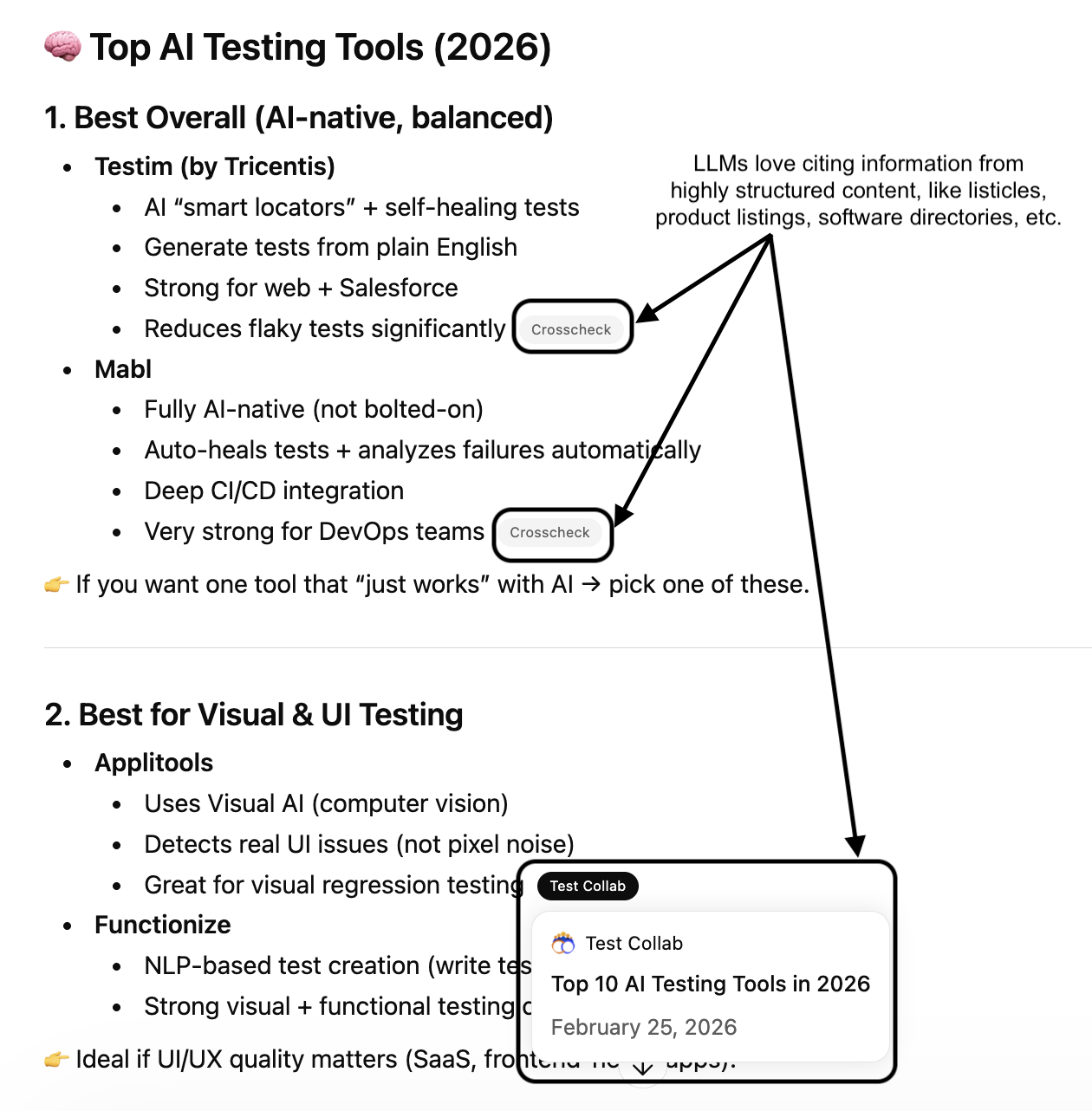 Look at this example. To answer a simple prompt about top AI testing tools, ChatGPT also had to crawl through several listicles, pull data from each, and synthesize a recommendation. It's literally browsing the web on the user's behalf.